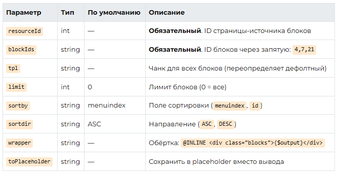 В бесплатной версии PageBlocks нет встроенного инструмента для вывода блоков с другой страницы. Этот сниппет решает задачу через xPDO-запрос к таблице pbBlockValue. Он позволяет выводить указанные блоки с любого ресурса, с опциями сортировки, лимита и обёртки.