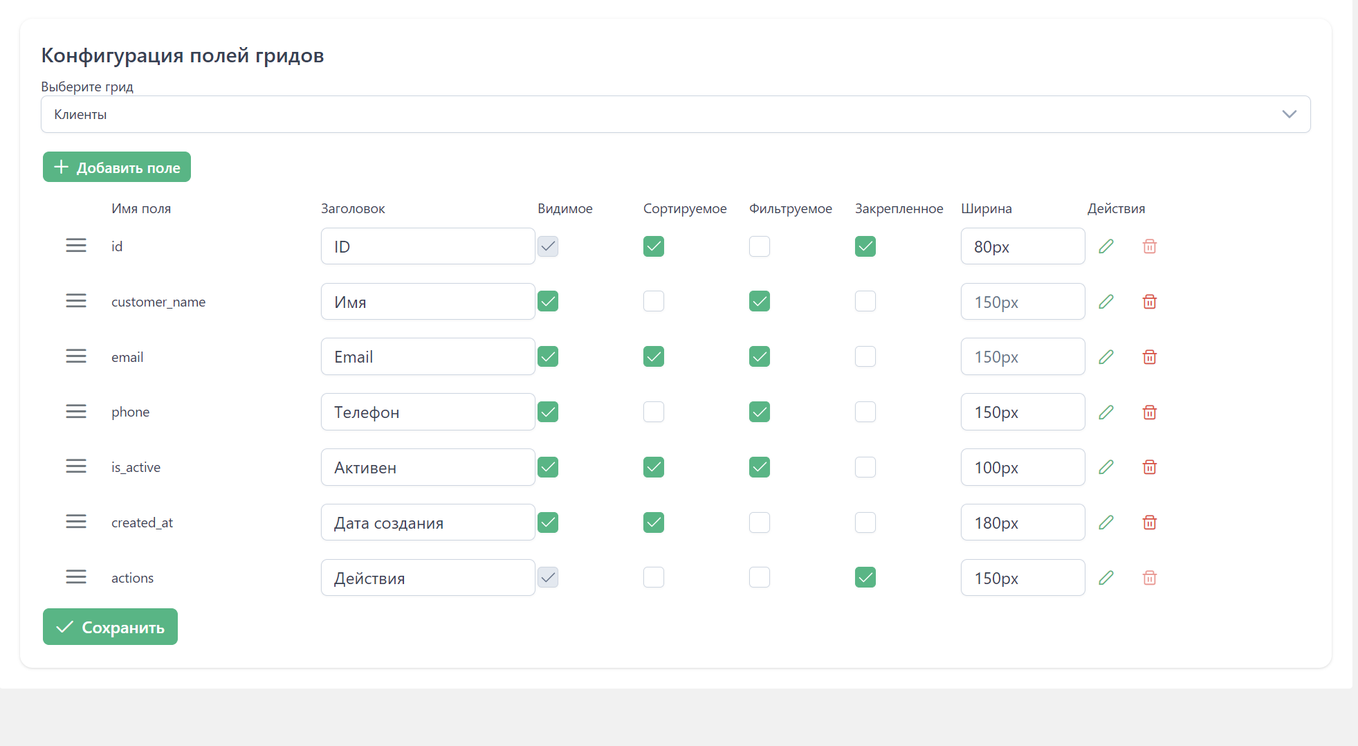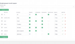 5. Поля-действия. Здесь настраиваем кнопки действий. Здесь предусмотрена отдельная логика с подключением JS скриптов. Подробнее будет в документации.