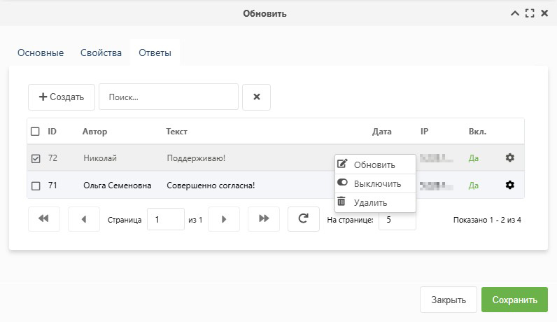- Вкладка «Комментарии» у ресурсов с указанными шаблонами