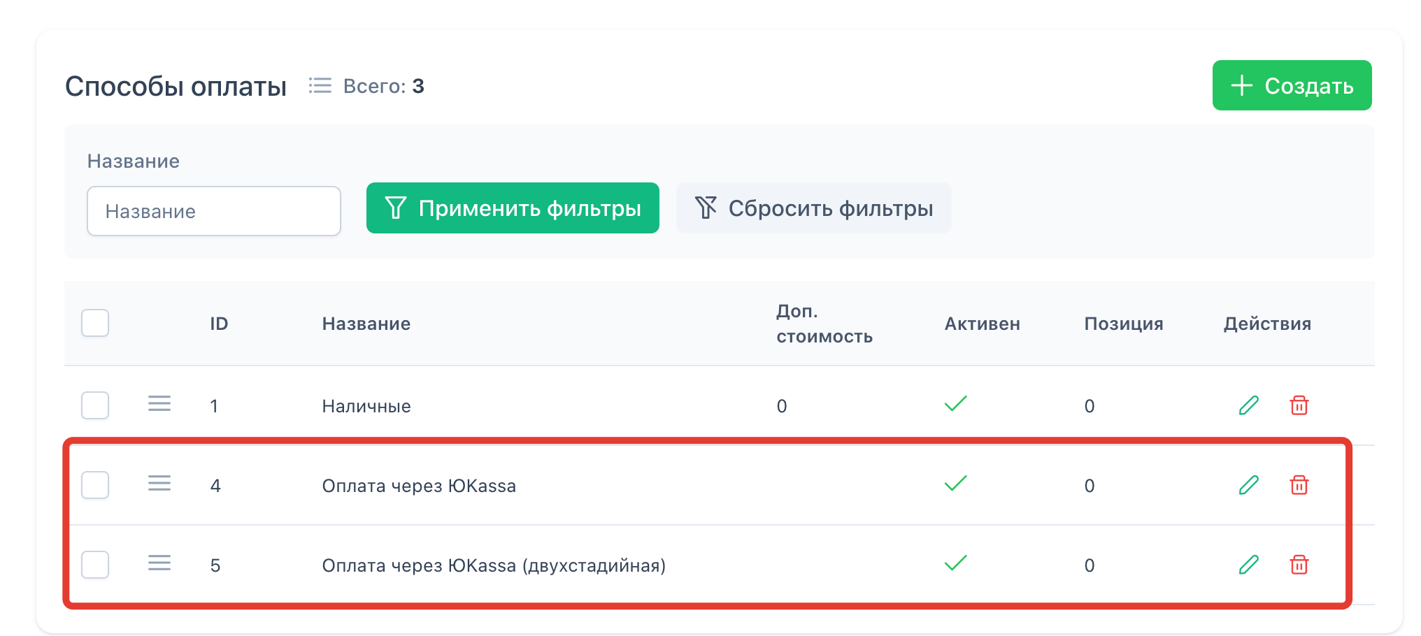 После установки в настройках MiniShop3 появляются два способа оплаты: