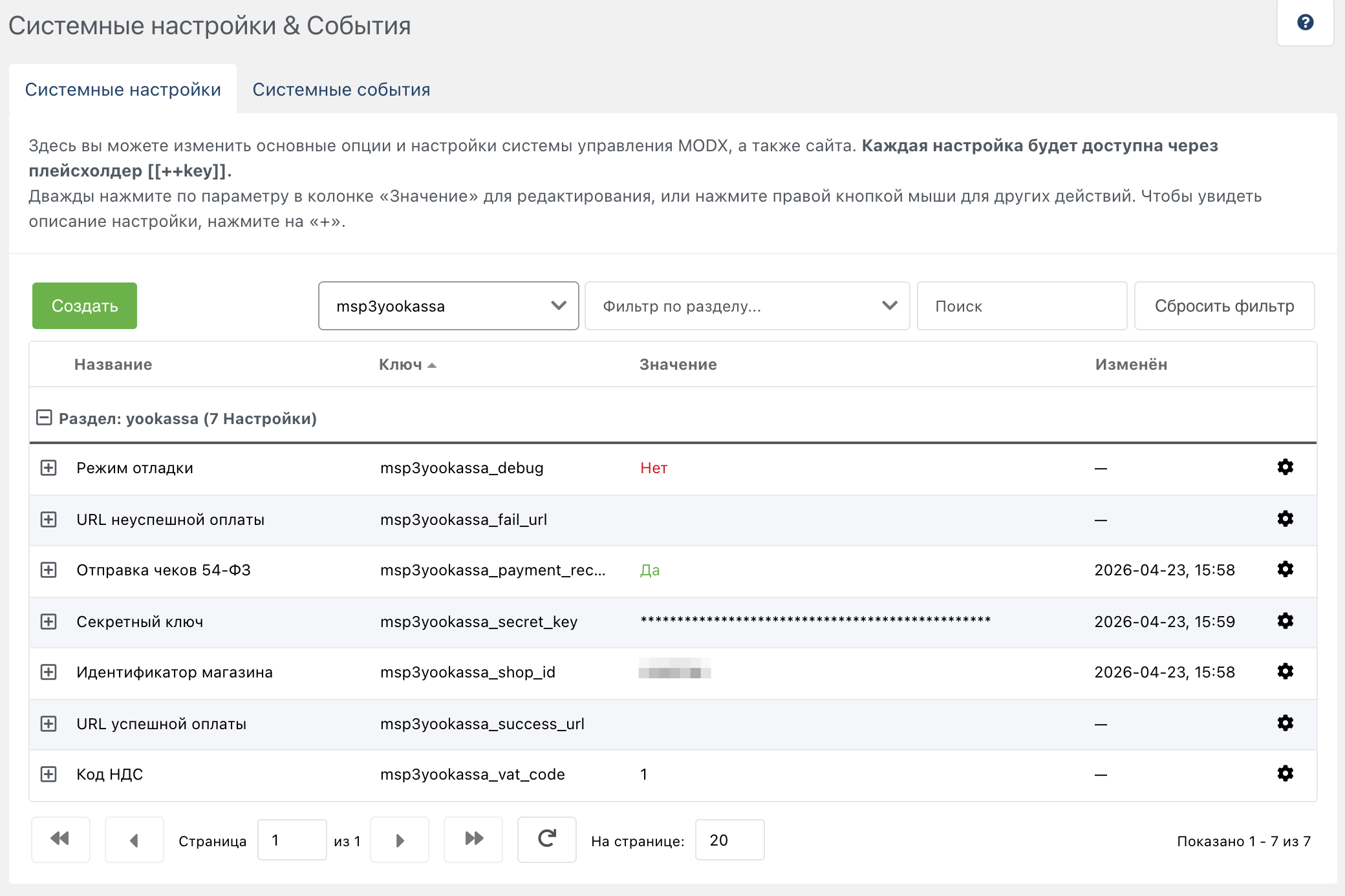 - В Системные настройки заполните msp3yookassa_shop_id и msp3yookassa_secret_key (боевые или test_).