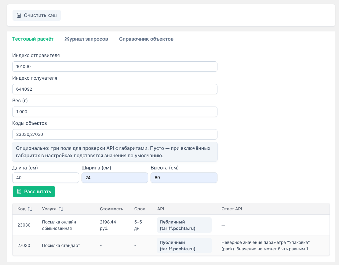 - Два API + fallback — публичный tariff и персональный otpravka; при ошибке или пустом ответе — добор через публичный API; кэш с настраиваемым TTL.