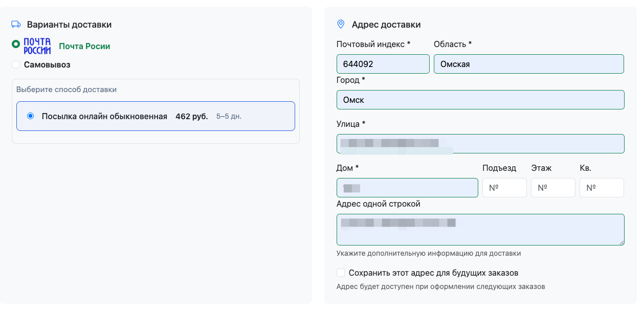 После выбора способа доставки «Почта России» в блоке msrp (класс msrp__wrapper, атрибут data-msrp-widget) — выбор варианта отправления, стоимость и срок. Индекс получателя (6 цифр) обычно обязателен; подсказки по адресу и индексу не встроены — рекомендуется mxDadata (сниппет mxDadataAddressSuggest до блока msRussianPost). Порядок подключения и события — в документации msRussianPost.