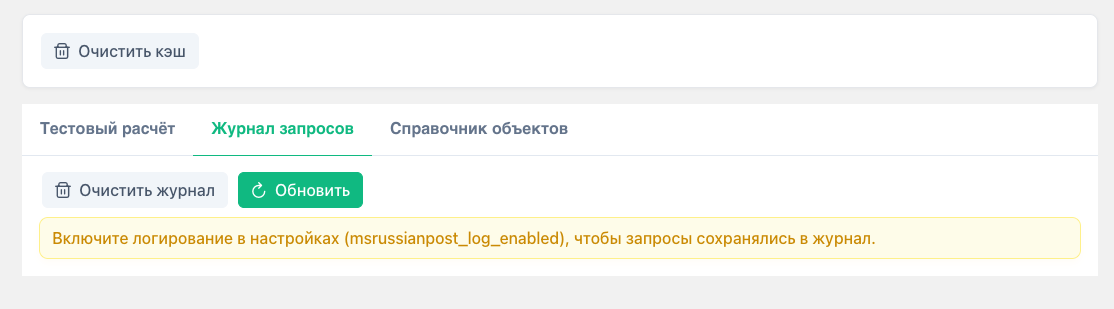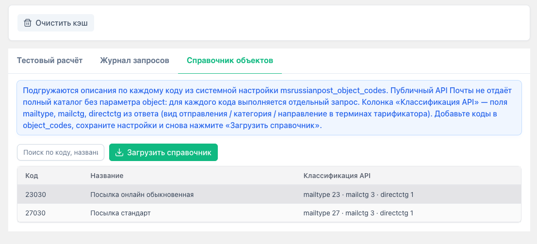 После установки в меню: раздел msRussianPost / Почта России — тестовый расчёт, журнал API-запросов, справочник кодов объектов, очистка кэша. Минимум в Системные настройки (фильтр msrussianpost): msrussianpost_delivery_id (ID доставки MS3), msrussianpost_sender_index, msrussianpost_object_codes; для режима договора — otpravka (токен и ключ).