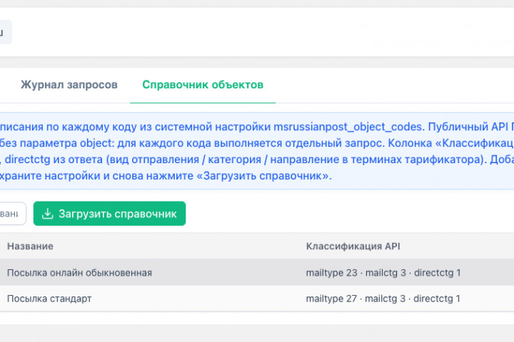 - В Системные настройки (namespace msrussianpost) укажите msrussianpost_delivery_id, msrussianpost_sender_index, msrussianpost_object_codes; при необходимости режим otpravka и ключи.