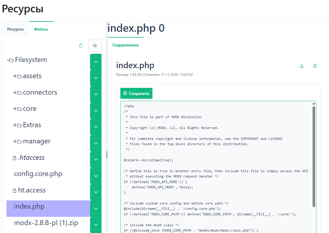 1. Дерево ресурсов MODX.