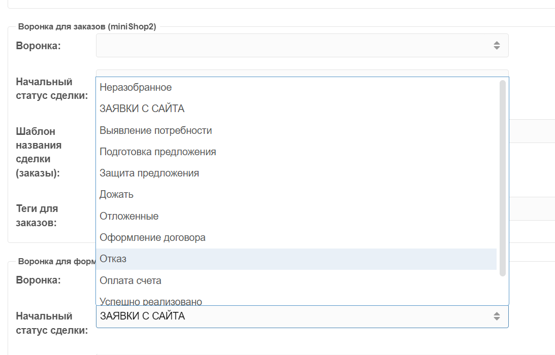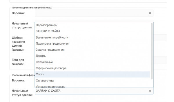 - Автоматическое создание сделок из заказов miniShop2