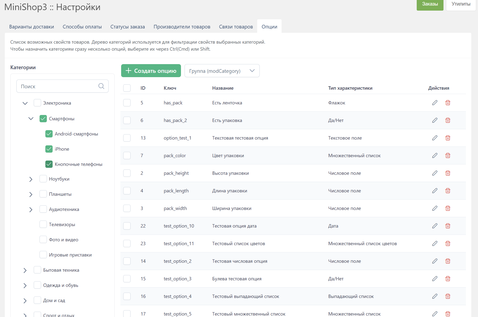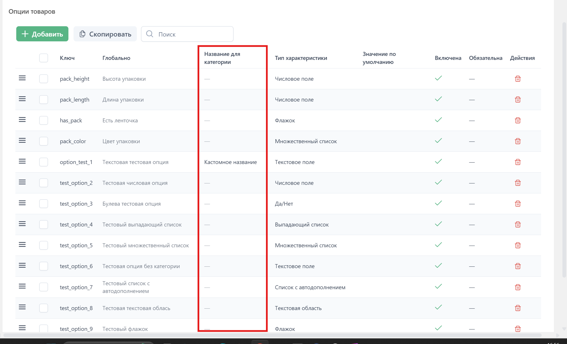 - Категория → Опции — drag-n-drop сортировка привязок, inline-редактор значения по умолчанию, массовые действия и удобный диалог «Копировать опции из другой категории» (сам не знал, что такой сценарий уже был заложен).