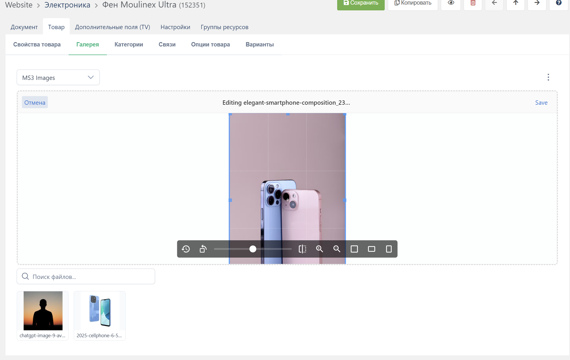 Старая ExtJS-прослойка (панель, тулбар, диалоги) ушла целиком. На её месте — Vue-компоненты: сетка с drag-n-drop для сортировки, контекстное меню, поиск и пагинация. Массовые действия вынесены в тулбар, отдельный диалог редактирования вызывается по клику. Uppy-загрузчик встроен прямо в бандл вкладок товара — больше никаких отдельных точек входа. В совокупности — минус ~900 строк ExtJS.