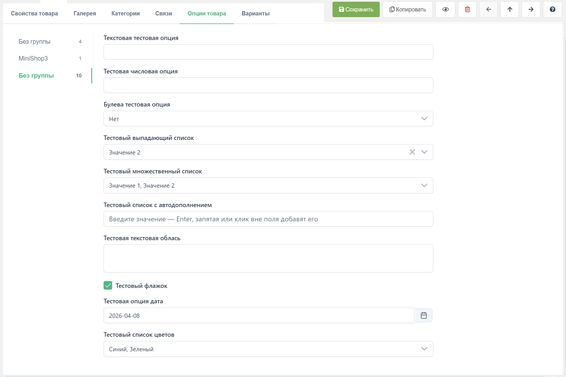 - Карточка товара → Опции товара — все десять типов опций переехали в новом исполнении, старые задумки сохранены. Для comboOptions появились чипы с автодобавлением по Enter или запятой и кликабельными подсказками под полем.