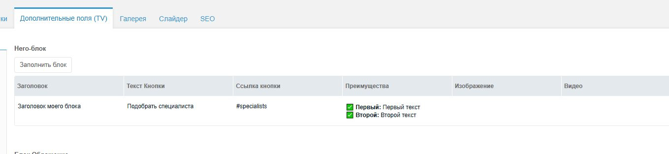 Открываю редактирование блока и там опять как будто бы ничего нет (Хотя на сайте всё выводится исправно)